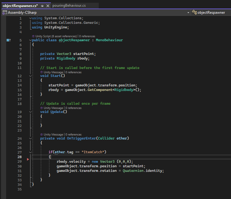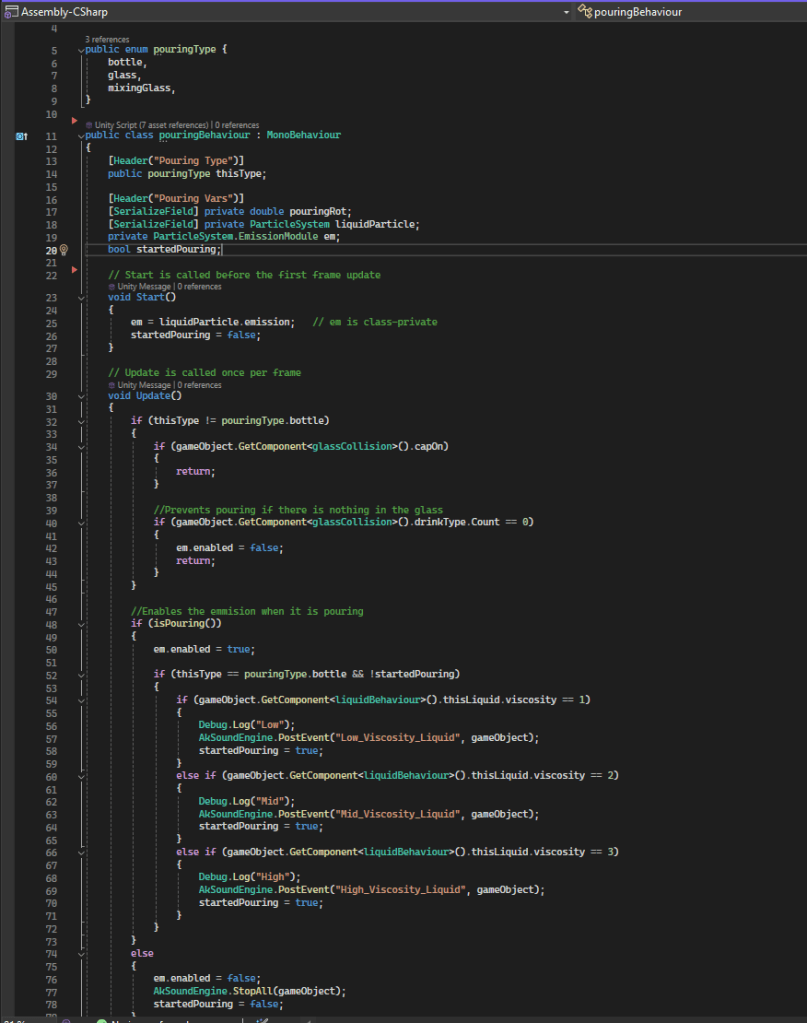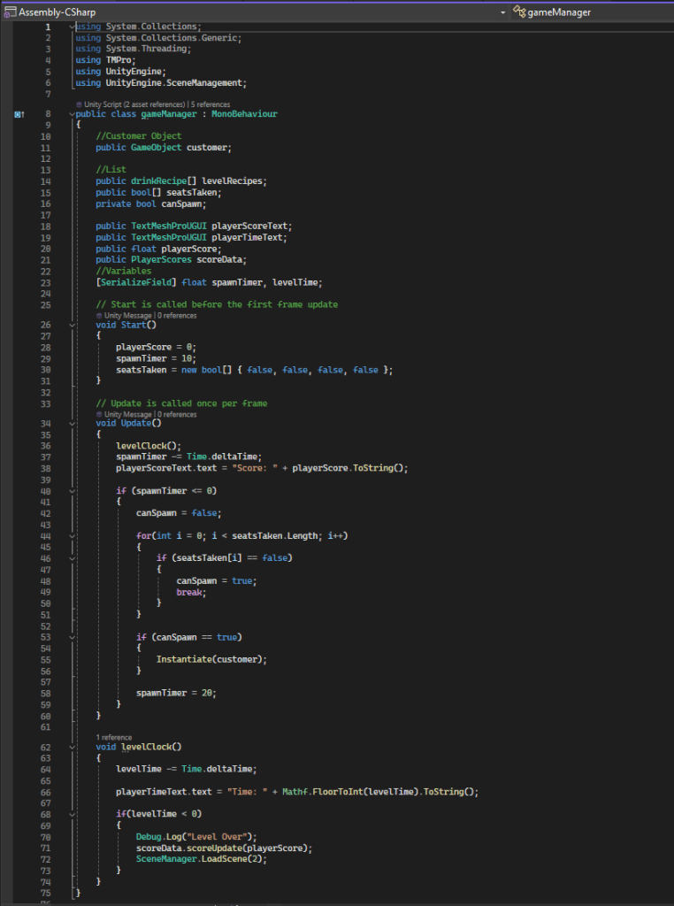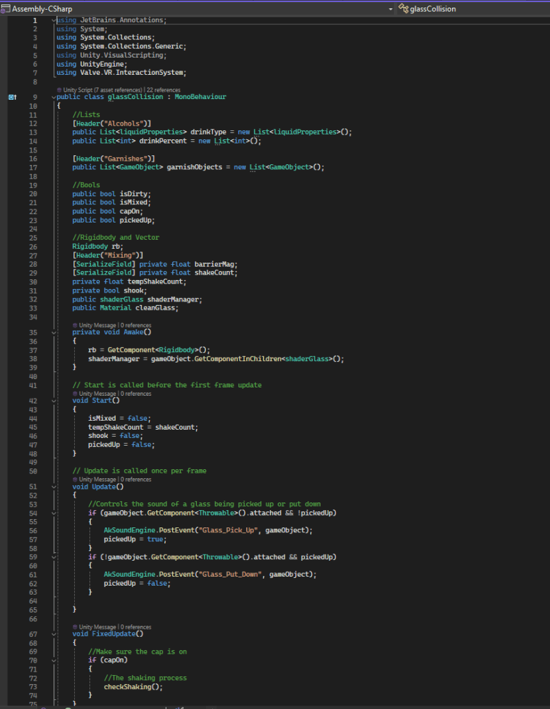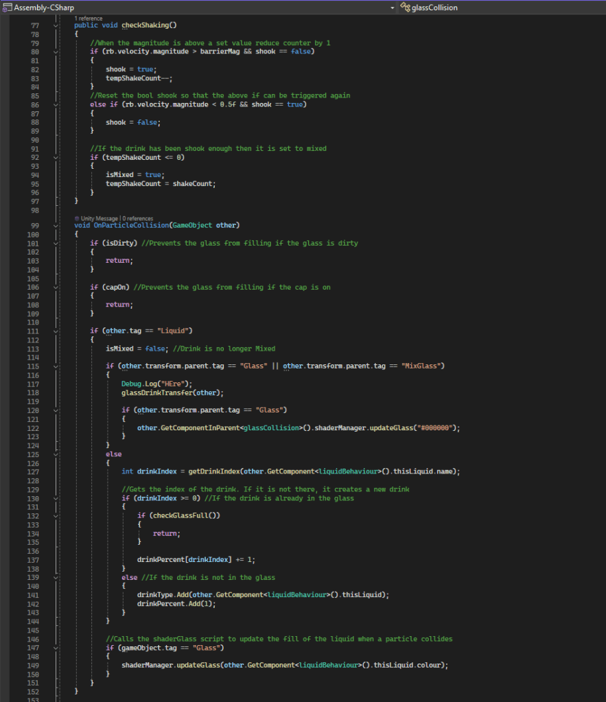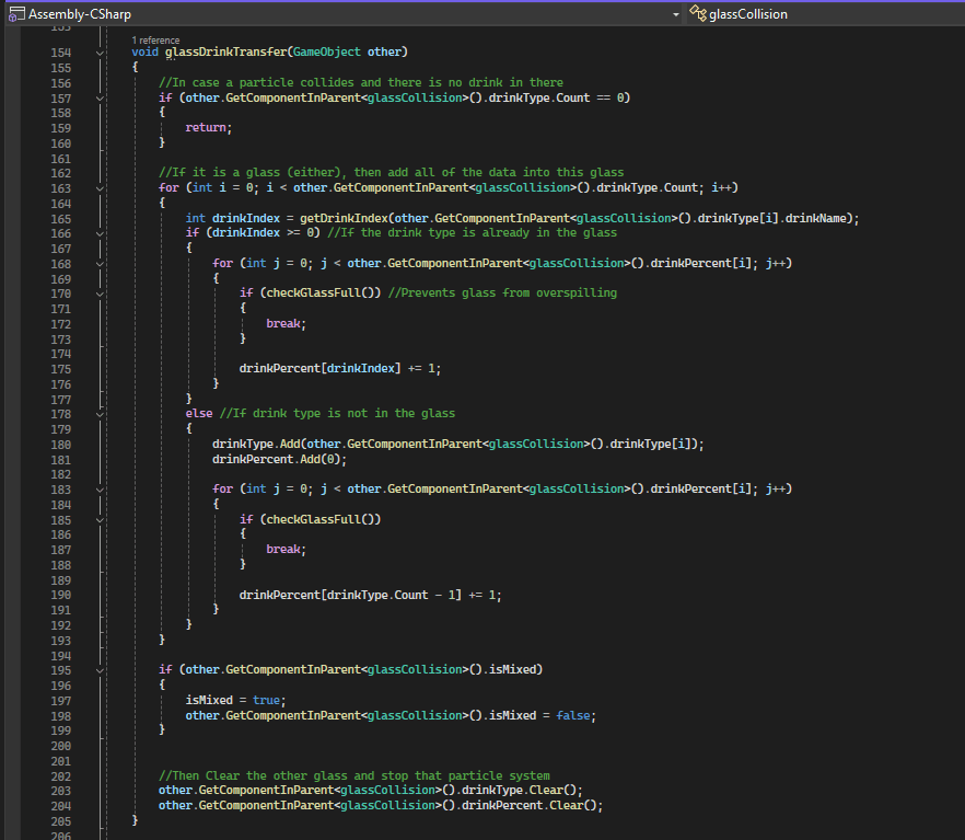 In this project, I programmed the drinks and each step in the process. Each drink has different ingredients which need to be poured into a mixer, and then the player must shake the mixer in their hands to succesffully mix the drink. Then, it can be poured into a glass and is served by throwing the glass at a customer. Each glass must then be picked up and put into the sink to clean them before they can be re-used. Below is a slideshow of the code I wrote to achieve these steps.